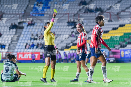Pachuca, Hidalgo, 19 de octubre de 2025. Itzel Hernández Fuentes, árbitro central, muestra tarjeta amarilla de amonestación para Casandra Montero, durante el partido correspondiente a la jornada 16 del torneo Apertura 2025 de la Liga BBVA MX Femenil, entre las Tuzas del Pachuca y las Chivas Rayadas del Guadalajara, realizado en el estadio Hidalgo. Foto: Imago7/ Mauricio Ruiz