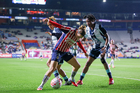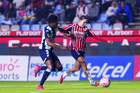 Pachuca, Hidalgo, 19 de octubre de 2025. Ohale Osinachi y Charlyn Corral, durante el partido correspondiente a la jornada 16 del torneo Apertura 2025 de la Liga BBVA MX Femenil, entre las Tuzas del Pachuca y las Chivas Rayadas del Guadalajara, realizado en el estadio Hidalgo. Foto: Imago7/ Manlio Contreras