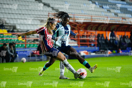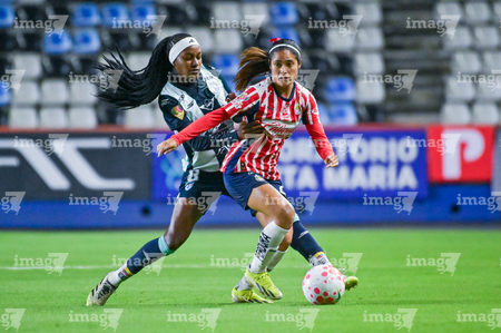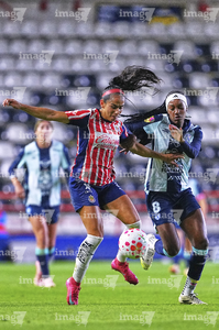 Pachuca, Hidalgo, 19 de octubre de 2025. Joseline Montoya y Yirleidis Quejada, durante el partido correspondiente a la jornada 16 del torneo Apertura 2025 de la Liga BBVA MX Femenil, entre las Tuzas del Pachuca y las Chivas Rayadas del Guadalajara, realizado en el estadio Hidalgo. Foto: Imago7/ Elizabeth Hernández
