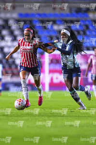 Pachuca, Hidalgo, 19 de octubre de 2025. Ayooluwa Oke y Casandra Montero, durante el partido correspondiente a la jornada 16 del torneo Apertura 2025 de la Liga BBVA MX Femenil, entre las Tuzas del Pachuca y las Chivas Rayadas del Guadalajara, realizado en el estadio Hidalgo. Foto: Imago7/ Jacqueline Pedraza