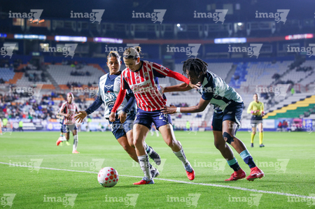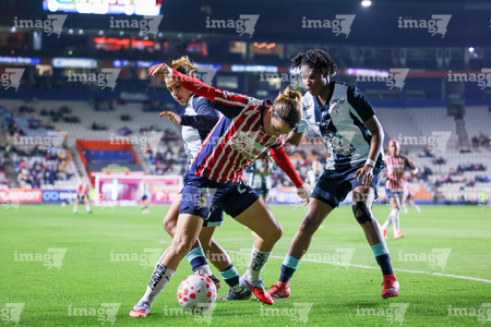 Pachuca, Hidalgo, 19 de octubre de 2025. Daniela Flores, Alicia Cervantes y Ohale Osinachi, durante el partido correspondiente a la jornada 16 del torneo Apertura 2025 de la Liga BBVA MX Femenil, entre las Tuzas del Pachuca y las Chivas Rayadas del Guadalajara, realizado en el estadio Hidalgo. Foto: Imago7/ Elizabeth Hernández