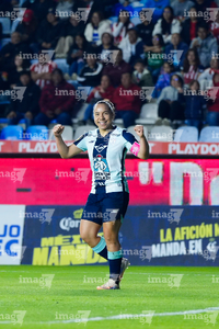 Pachuca, Hidalgo, 19 de octubre de 2025. Esthefanny Barreras en festejo, durante el partido correspondiente a la jornada 16 del torneo Apertura 2025 de la Liga BBVA MX Femenil, entre las Tuzas del Pachuca y las Chivas Rayadas del Guadalajara, realizado en el estadio Hidalgo. Foto: Imago7/ Elizabeth Hernández