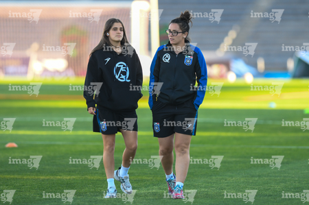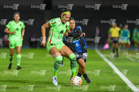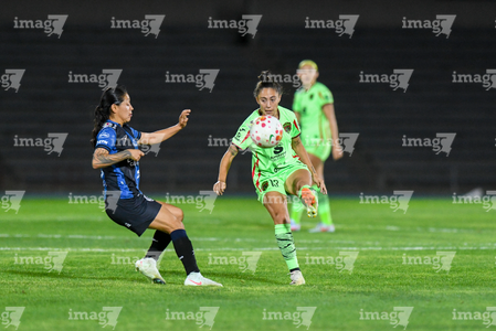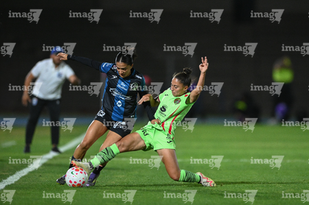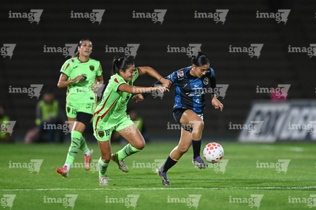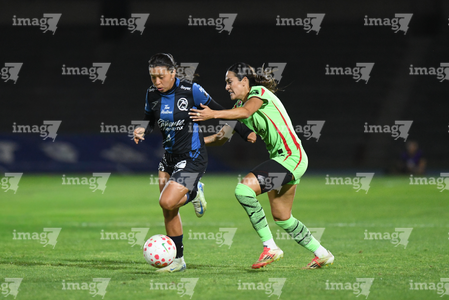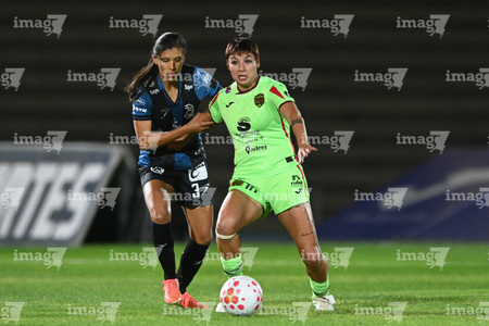 Ciudad Juárez, Chihuahua, 31 de octubre de 2025. Karime Abud y Lía Moran, durante el partido correspondiente a la jornada 17 del torneo Apertura 2025 de la Liga BBVA MX Femenil, entre las Bravas de FC Juárez y el Club Querétaro, realizado en realizado en el estadio Olímpico Benito Juárez. Foto: Imago7/ José Zamora