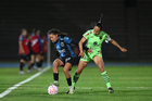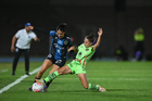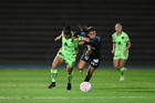 Ciudad Juárez, Chihuahua, 31 de octubre de 2025. Destinney Duron y Bianca Mora, durante el partido correspondiente a la jornada 17 del torneo Apertura 2025 de la Liga BBVA MX Femenil, entre las Bravas de FC Juárez y el Club Querétaro, realizado en realizado en el estadio Olímpico Benito Juárez. Foto: Imago7/ José Zamora