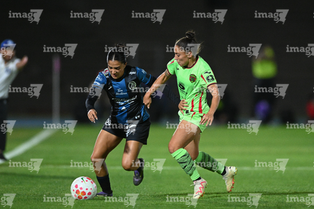 Ciudad Juárez, Chihuahua, 31 de octubre de 2025. Lía Moran y Liliana Mercado, durante el partido correspondiente a la jornada 17 del torneo Apertura 2025 de la Liga BBVA MX Femenil, entre las Bravas de FC Juárez y el Club Querétaro, realizado en realizado en el estadio Olímpico Benito Juárez. Foto: Imago7/ José Zamora