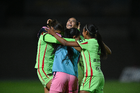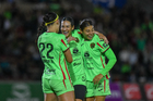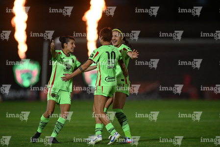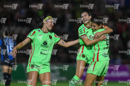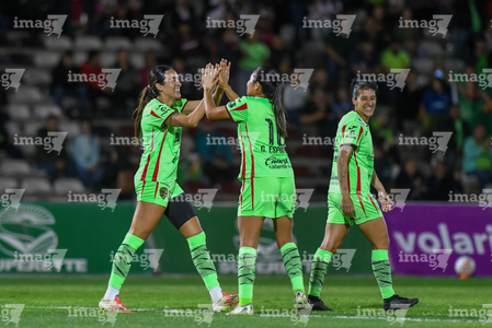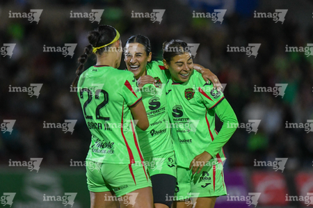 Ciudad Juárez, Chihuahua, 31 de octubre de 2025. Bianca Mora, Jasmine Casarez y Amanda Murillo en festejo de gol, durante el partido correspondiente a la jornada 17 del torneo Apertura 2025 de la Liga BBVA MX Femenil, entre las Bravas de FC Juárez y el Club Querétaro, realizado en realizado en el estadio Olímpico Benito Juárez. Foto: Imago7/Alejandro Rodriguez