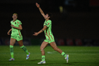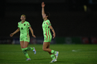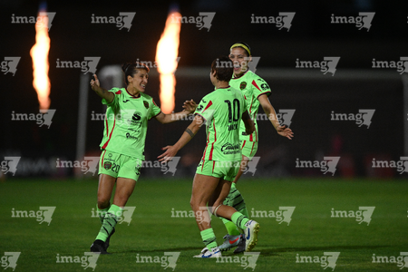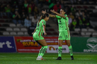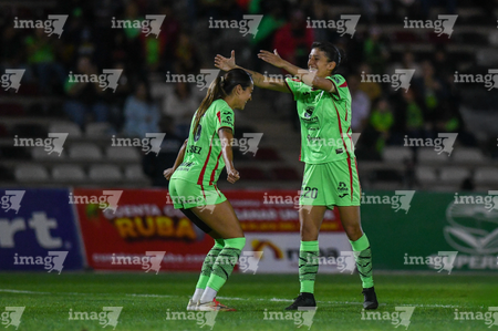 Ciudad Juárez, Chihuahua, 31 de octubre de 2025. Jasmine Casarez y Karime Abud en festejo de gol, durante el partido correspondiente a la jornada 17 del torneo Apertura 2025 de la Liga BBVA MX Femenil, entre las Bravas de FC Juárez y el Club Querétaro, realizado en realizado en el estadio Olímpico Benito Juárez. Foto: Imago7/Alejandro Rodriguez