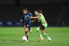 Ciudad Juárez, Chihuahua, 31 de octubre de 2025. Giselle Espinoza y Daniela Carrandi, durante el partido correspondiente a la jornada 17 del torneo Apertura 2025 de la Liga BBVA MX Femenil, entre las Bravas de FC Juárez y el Club Querétaro, realizado en realizado en el estadio Olímpico Benito Juárez. Foto: Imago7/ José Zamora