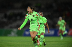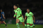 Ciudad Juárez, Chihuahua, 31 de octubre de 2025. Jasmine Casarez y Giselle Espinoza en festejo de gol, durante el partido correspondiente a la jornada 17 del torneo Apertura 2025 de la Liga BBVA MX Femenil, entre las Bravas de FC Juárez y el Club Querétaro, realizado en realizado en el estadio Olímpico Benito Juárez. Foto: Imago7/Alejandro Rodriguez