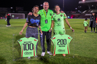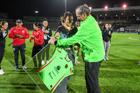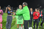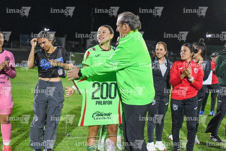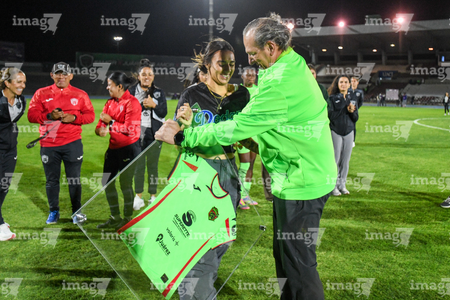 Ciudad Juárez, Chihuahua, 31 de octubre de 2025. Jesus Mestas entrega reconocimiento a Norma Palafox, durante el partido correspondiente a la jornada 17 del torneo Apertura 2025 de la Liga BBVA MX Femenil, entre las Bravas de FC Juárez y el Club Querétaro, realizado en realizado en el estadio Olímpico Benito Juárez. Foto: Imago7/Alejandro Rodriguez