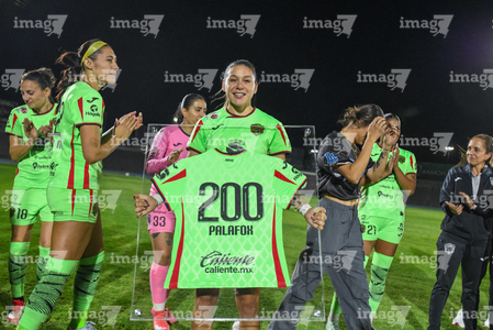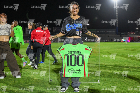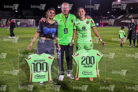 Ciudad Juárez, Chihuahua, 31 de octubre de 2025. FC Juarez entrega reconocimiento por trayectoria a Destinney Duron y Norma Palafox, durante el partido correspondiente a la jornada 17 del torneo Apertura 2025 de la Liga BBVA MX Femenil, entre las Bravas de FC Juárez y el Club Querétaro, realizado en realizado en el estadio Olímpico Benito Juárez. Foto: Imago7/Alejandro Rodriguez