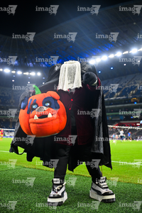 Guadalupe, Nuevo León, 31 de octubre de 2025. Monty, mascota de Rayados, disfrazado con motivo del Halloween, durante el partido correspondiente a la jornada 17 del torneo Apertura 2025 de la Liga BBVA MX Femenil, entre las Rayadas del Monterrey y las Rojinegras del Atlas, realizado en el estadio BBVA. Foto: Imago7/ Andrea Jiménez