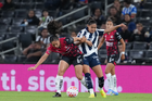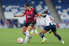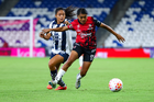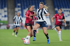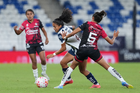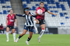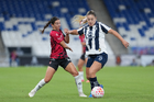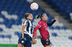 Guadalupe, Nuevo León, 31 de octubre de 2025. Kayla Fernandez y Nicole Pérez, durante el partido correspondiente a la jornada 17 del torneo Apertura 2025 de la Liga BBVA MX Femenil, entre las Rayadas del Monterrey y las Rojinegras del Atlas, realizado en el estadio BBVA. Foto: Imago7/ Andrea Jiménez
