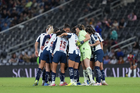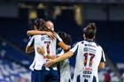 Guadalupe, Nuevo León, 31 de octubre de 2025. Jugadoras de Rayadas, durante el partido correspondiente a la jornada 17 del torneo Apertura 2025 de la Liga BBVA MX Femenil, entre las Rayadas del Monterrey y las Rojinegras del Atlas, realizado en el estadio BBVA. Foto: Imago7/ Andrea Jiménez