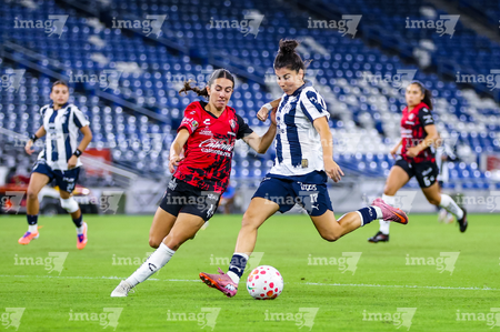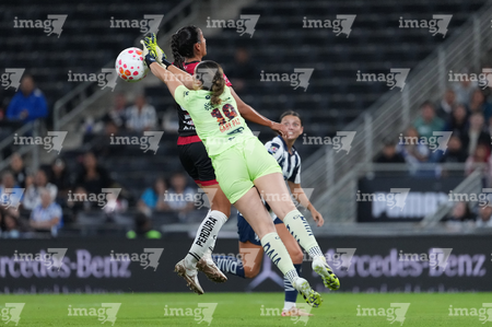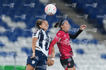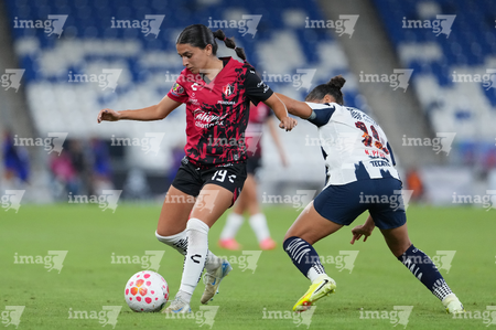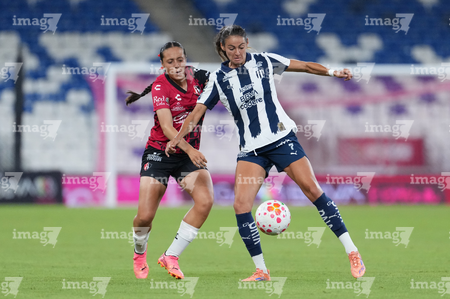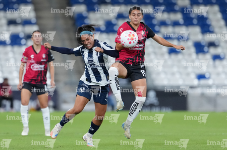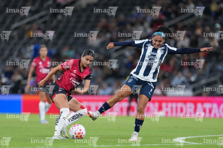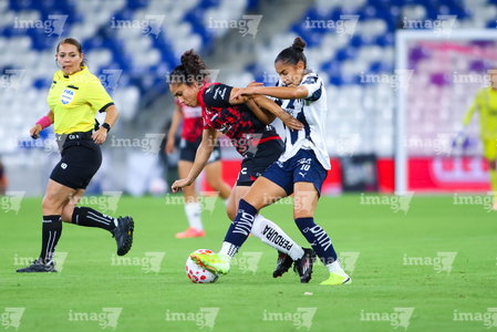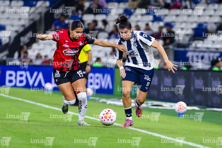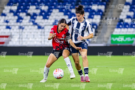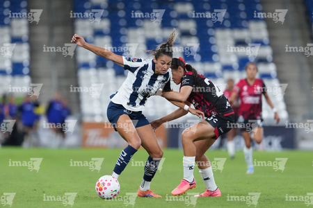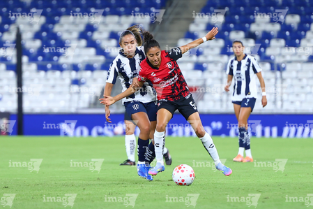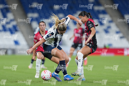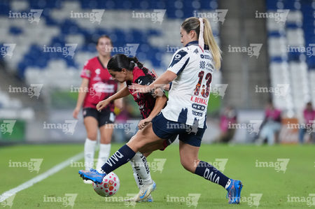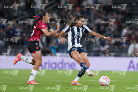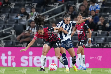 Guadalupe, Nuevo León, 31 de octubre de 2025. Ashlyn Fernandez y Paola García, durante el partido correspondiente a la jornada 17 del torneo Apertura 2025 de la Liga BBVA MX Femenil, entre las Rayadas del Monterrey y las Rojinegras del Atlas, realizado en el estadio BBVA. Foto: Imago7/ Andrea Jiménez