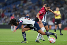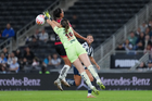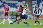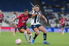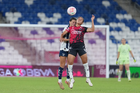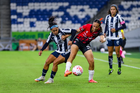 Guadalupe, Nuevo León, 31 de octubre de 2025. Victoria Acevedo y Nicole Pérez, durante el partido correspondiente a la jornada 17 del torneo Apertura 2025 de la Liga BBVA MX Femenil, entre las Rayadas del Monterrey y las Rojinegras del Atlas, realizado en el estadio BBVA. Foto: Imago7/David Arzamendi