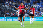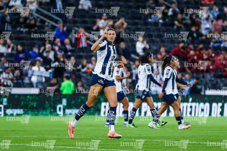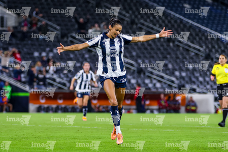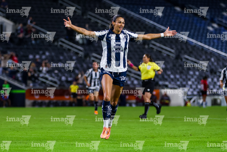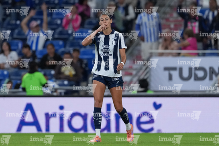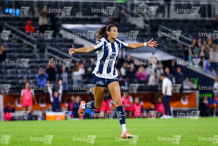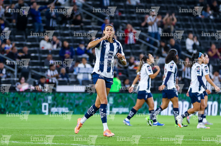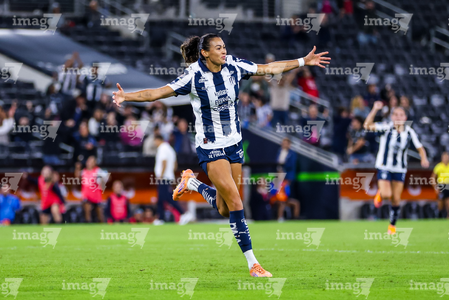 Guadalupe, Nuevo León, 31 de octubre de 2025. Brenda Ceren en festejo de gol, durante el partido correspondiente a la jornada 17 del torneo Apertura 2025 de la Liga BBVA MX Femenil, entre las Rayadas del Monterrey y las Rojinegras del Atlas, realizado en el estadio BBVA. Foto: Imago7/David Arzamendi