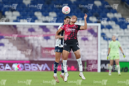 Guadalupe, Nuevo León, 31 de octubre de 2025. Daniela Meza y Christina Burkenroad, durante el partido correspondiente a la jornada 17 del torneo Apertura 2025 de la Liga BBVA MX Femenil, entre las Rayadas del Monterrey y las Rojinegras del Atlas, realizado en el estadio BBVA. Foto: Imago7/ Andrea Jiménez