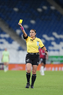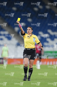 Guadalupe, Nuevo León, 31 de octubre de 2025. Francia María González, árbitra central, muestra tarjeta amarilla de amonestación, durante el partido correspondiente a la jornada 17 del torneo Apertura 2025 de la Liga BBVA MX Femenil, entre las Rayadas del Monterrey y las Rojinegras del Atlas, realizado en el estadio BBVA. Foto: Imago7/ Andrea Jiménez