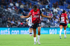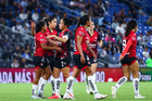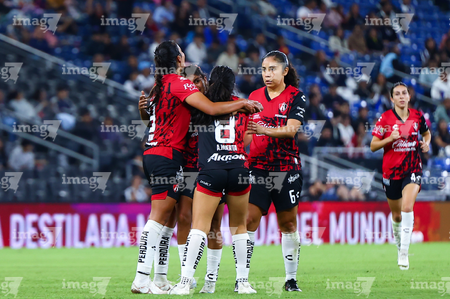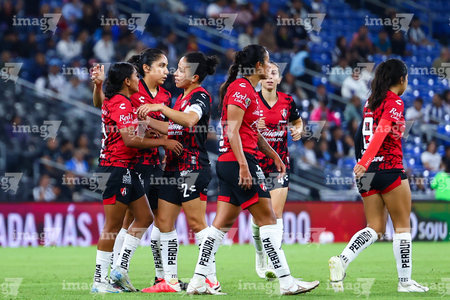 Guadalupe, Nuevo León, 31 de octubre de 2025. Jugadoras del Atlas en festejo de gol, durante el partido correspondiente a la jornada 17 del torneo Apertura 2025 de la Liga BBVA MX Femenil, entre las Rayadas del Monterrey y las Rojinegras del Atlas, realizado en el estadio BBVA. Foto: Imago7/
