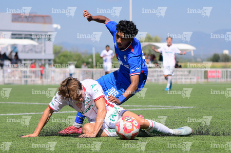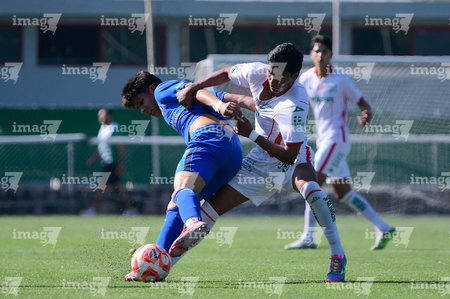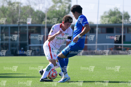 Aguascalientes, Aguascalientes, 24 de septiembre de 2025. Kevin Solorio y Yosgar Mayen, durante el partido correspondiente a la jornada 9 del torneo Apertura 2025 de la Liga BBVA MX categoría Sub17, entre los Rayos del Necaxa y la Máquina Celeste del Cruz Azul, realizado en la Casa Club del Necaxa. Foto: Imago7/ Pablo Ramirez