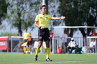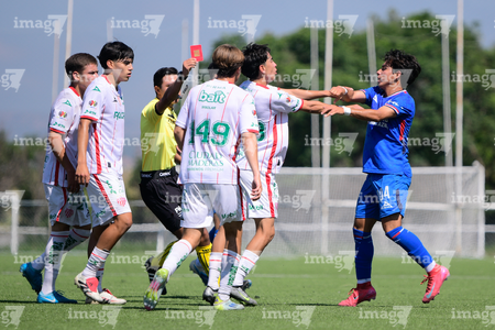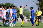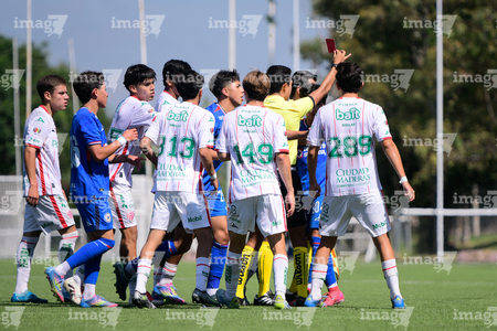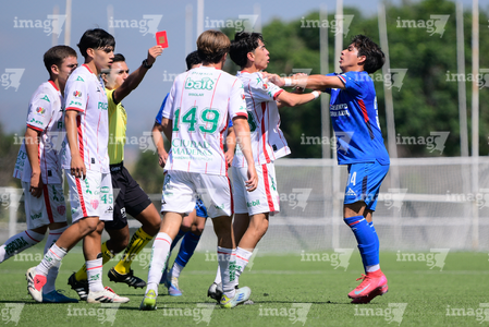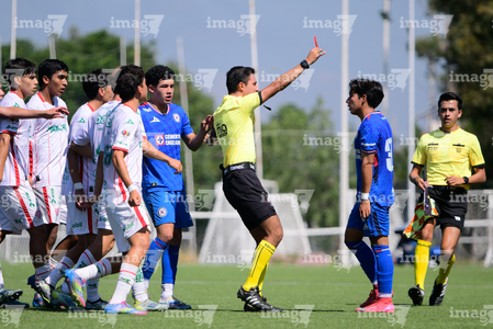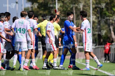 Aguascalientes, Aguascalientes, 24 de septiembre de 2025. Ricardo Sebastián Arellano muestra tarjeta roja de expulsión, durante el partido correspondiente a la jornada 9 del torneo Apertura 2025 de la Liga BBVA MX categoría Sub17, entre los Rayos del Necaxa y la Máquina Celeste del Cruz Azul, realizado en la Casa Club del Necaxa. Foto: Imago7/ Pablo Ramirez