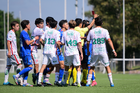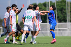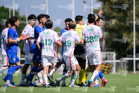 Aguascalientes, Aguascalientes, 24 de septiembre de 2025. Jugadores de Necaxa en conato de bronca, durante el partido correspondiente a la jornada 9 del torneo Apertura 2025 de la Liga BBVA MX categoría Sub17, entre los Rayos del Necaxa y la Máquina Celeste del Cruz Azul, realizado en la Casa Club del Necaxa. Foto: Imago7/ Pablo Ramirez