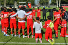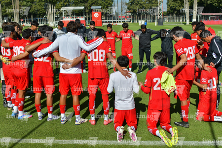 Metepec, Estado de México, 20 de agosto de 2025. Jugadores de Toluca Sub17, durante el partido correspondiente a la jornada 11 del torneo Apertura 2025 de la Liga BBVA MX categoría Sub17, entre los Diablos Rojos del Toluca y la Máquina Celeste del Cruz Azul, realizado en las instalaciones de Metepec. Foto: Imago7/