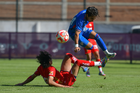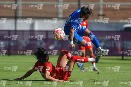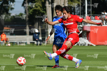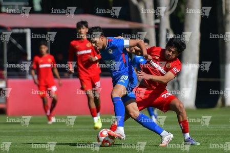 Metepec, Estado de México, 20 de agosto de 2025. Osvaldo Ramírez y Santiago López, durante el partido correspondiente a la jornada 11 del torneo Apertura 2025 de la Liga BBVA MX categoría Sub17, entre los Diablos Rojos del Toluca y la Máquina Celeste del Cruz Azul, realizado en las instalaciones de Metepec. Foto: Imago7/ Arturo Hernandez