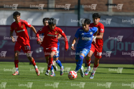 , durante el partido correspondiente a la jornada 11 del torneo Apertura 2025 de la Liga BBVA MX categoría Sub17, entre los Diablos Rojos del Toluca y la Máquina Celeste del Cruz Azul, realizado en las instalaciones de Metepec. Foto: Imago7/
