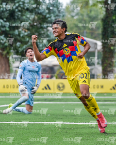 Ciudad de México, 20 de septiembre de 2025. Jareth Morales en festejo de gol, durante el partido correspondiente a la jornada 11 del torneo Apertura 2025 de la Liga BBVA MX categoría Sub17, entre las Águilas del América y los Rayos del Necaxa, realizado en Coapa. Foto: Imago7/ Mauricio Ruiz