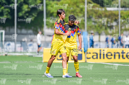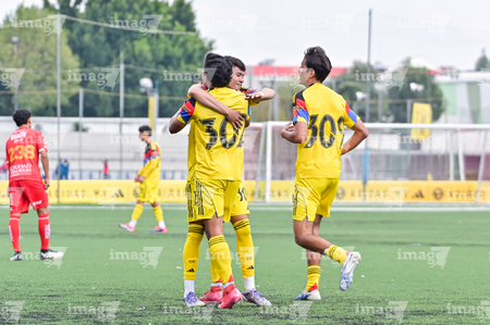Ciudad de México, 20 de septiembre de 2025. Jugadores del Club América Sub17 en festejo de gol, durante el partido correspondiente a la jornada 11 del torneo Apertura 2025 de la Liga BBVA MX categoría Sub17, entre las Águilas del América y los Rayos del Necaxa, realizado en Coapa. Foto: Imago7/ Mauricio Ruiz