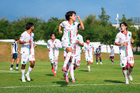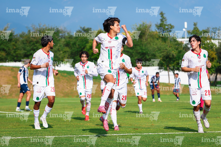 Santiago, Nuevo León, 27 de septiembre de 2025. Jugadores de Chivas Sub17 en festejo de gol, durante el partido correspondiente a la jornada 12 del torneo Apertura 2025 de la Liga BBVA MX categoría Sub17, entre los Rayados del Monterrey y las Chivas Rayadas del Guadalajara, realizado en El Barrial. Foto: Imago7/ David Arzamendi