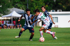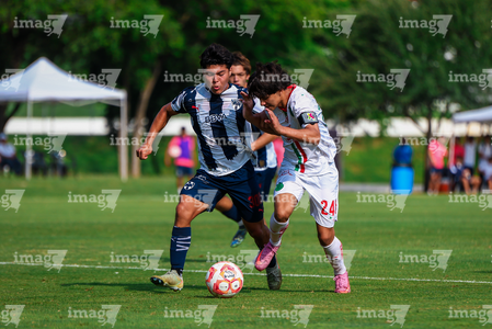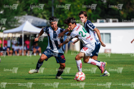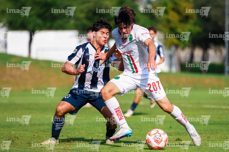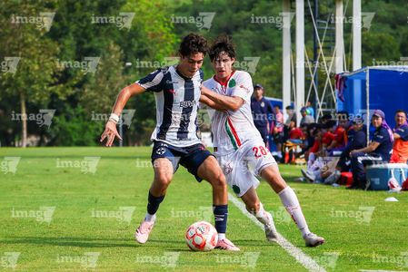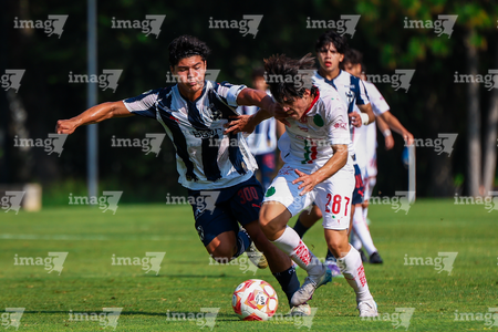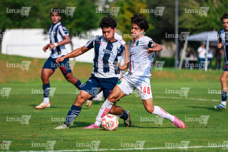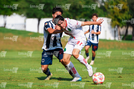 Santiago, Nuevo León, 27 de septiembre de 2025. Santiago Bermúdez y Gerson Gutiérrez, durante el partido correspondiente a la jornada 12 del torneo Apertura 2025 de la Liga BBVA MX categoría Sub17, entre los Rayados del Monterrey y las Chivas Rayadas del Guadalajara, realizado en El Barrial. Foto: Imago7/ David Arzamendi
