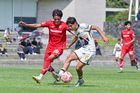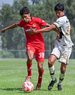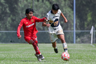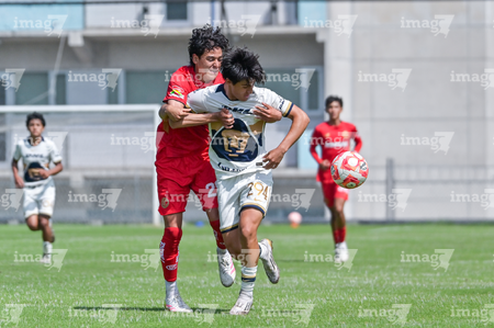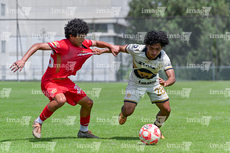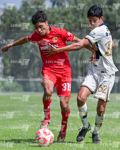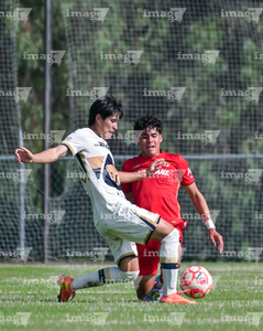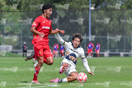 Ciudad de México, 27 de septiembre de 2025. Dariel Millán y Roberto Hernández, durante el partido correspondiente a la jornada 12 del torneo Apertura 2025 de la Liga BBVA MX categoría Sub17, entre los Pumas de la UNAM y los Diablos Rojos del Toluca, realizado en Cantera. Foto: Imago7/
