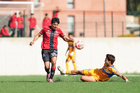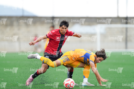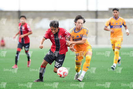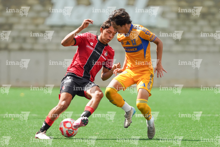 Guadalajara, Jalisco, 27 de septiembre de 2025. Daniel Hernández y Emilio Ocañas, durante el partido correspondiente a la jornada 12 del torneo Apertura 2025 de la Liga BBVA MX categoría Sub17, entre los Rojinegros del Atlas y los Tigres de la UANL, realizado en la Academia AGA. Foto: Imago7/ Andres Sepulveda