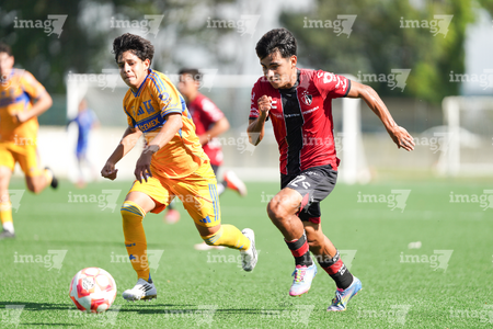 Guadalajara, Jalisco, 27 de septiembre de 2025. Leonardo Espino, durante el partido correspondiente a la jornada 12 del torneo Apertura 2025 de la Liga BBVA MX categoría Sub17, entre los Rojinegros del Atlas y los Tigres de la UANL, realizado en la Academia AGA. Foto: Imago7/ Andres Sepulveda
