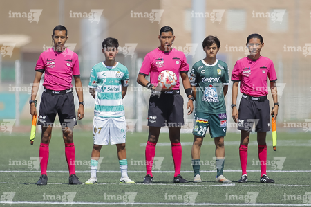 Torreón, Coahuila, 4 de octubre de 2025. Protocolo, durante el partido correspondiente a la jornada 13 del torneo Apertura 2025 de la Liga BBVA MX categoría Sub17, entre los Guerreros de Santos Laguna y los Esmeraldas de León, realizado en el TSM. Foto: Imago7/ Saul Perales