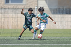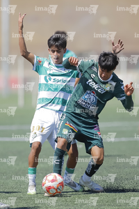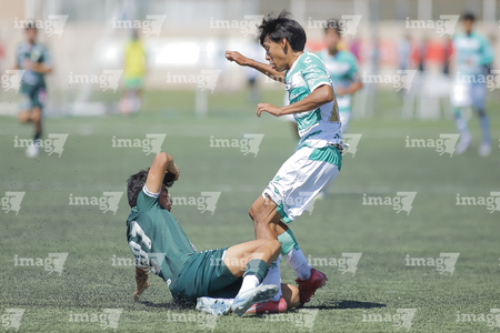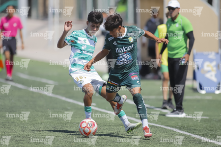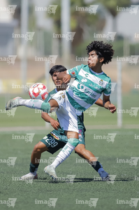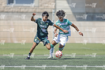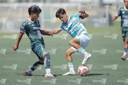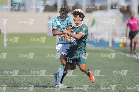 Torreón, Coahuila, 4 de octubre de 2025. Issac Espinosa y Yocsan Hernández, durante el partido correspondiente a la jornada 13 del torneo Apertura 2025 de la Liga BBVA MX categoría Sub17, entre los Guerreros de Santos Laguna y los Esmeraldas de León, realizado en el TSM. Foto: Imago7/ Saul Perales
