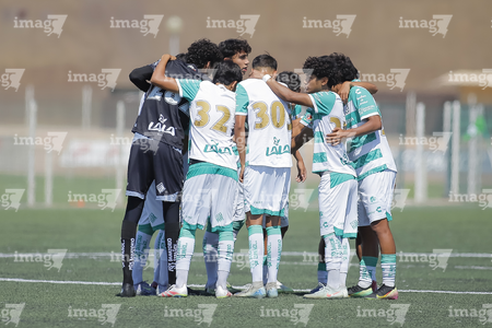 Torreón, Coahuila, 4 de octubre de 2025. Jugadores del Santos Laguna, durante el partido correspondiente a la jornada 13 del torneo Apertura 2025 de la Liga BBVA MX categoría Sub17, entre los Guerreros de Santos Laguna y los Esmeraldas de León, realizado en el TSM. Foto: Imago7/ Saul Perales