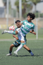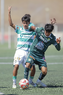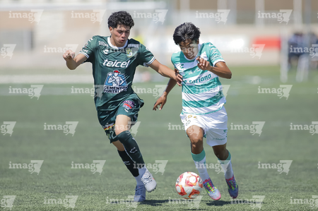 Torreón, Coahuila, 4 de octubre de 2025. Jesús Macías y Diego Chávez, durante el partido correspondiente a la jornada 13 del torneo Apertura 2025 de la Liga BBVA MX categoría Sub17, entre los Guerreros de Santos Laguna y los Esmeraldas de León, realizado en el TSM. Foto: Imago7/ Saul Perales