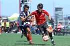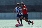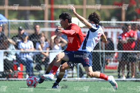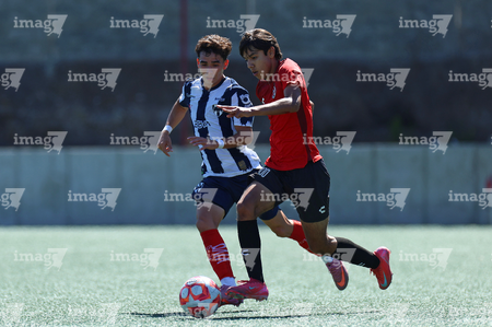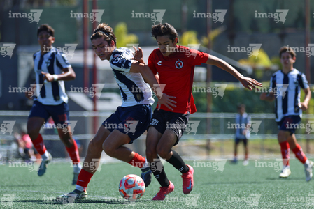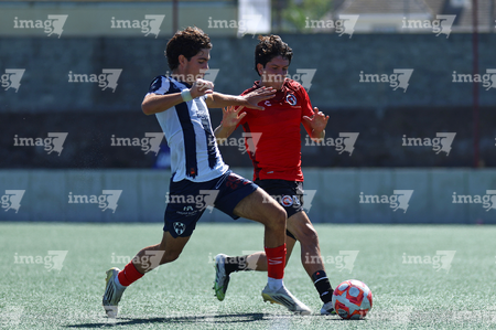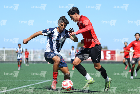 Tijuana, Baja California, 4 de octubre de 2025. Sebastián Olivarez y José Mendoza, durante el partido correspondiente a la jornada 13 del torneo Apertura 2025 de la Liga BBVA MX categoría Sub17, entre los Xolos de Tijuana y los Rayados de Monterrey, realizado en el Centro de Iniciación Xoloitzcuintle. Foto: Imago7/ David Vega