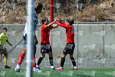 Tijuana, Baja California, 4 de octubre de 2025. Jugadores de Xolos en festejo de gol, durante el partido correspondiente a la jornada 13 del torneo Apertura 2025 de la Liga BBVA MX categoría Sub17, entre los Xolos de Tijuana y los Rayados de Monterrey, realizado en el Centro de Iniciación Xoloitzcuintle. Foto: Imago7/ David Vega