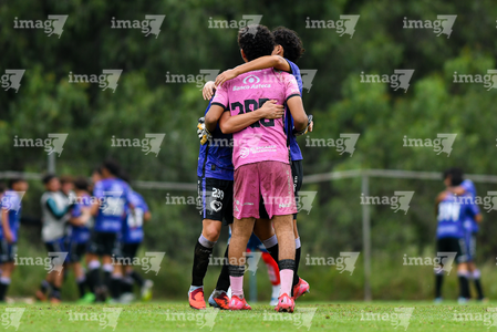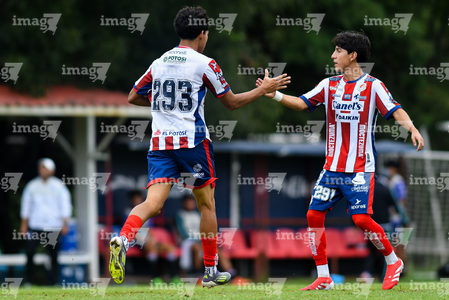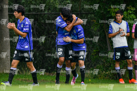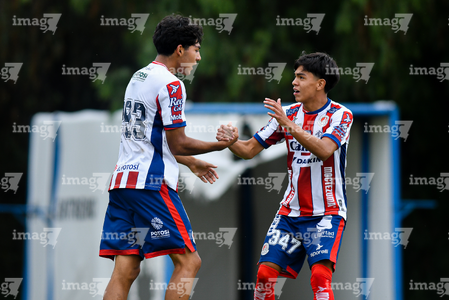 San Luis Potosí, San Luis Potosí, 11 de octubre de 2025. Jugadores de San Luis Sub17 en festejo de gol, durante el partido correspondiente a la jornada 14 del torneo Apertura 2025 de la Liga BBVA MX, entre el Atlético San Luis y los Cañoneros de Mazatlán, realizado en La Presa. Foto: Imago7/ Olimpia Puga