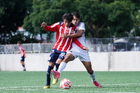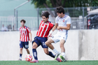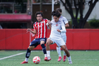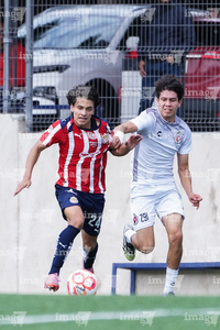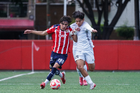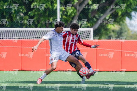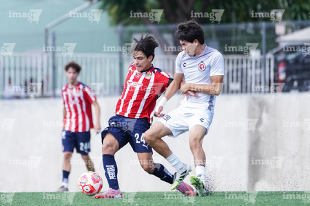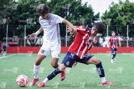 Zapopan, Jalisco, 11 de octubre de 2025. Alberto Castillo y Dilan Ruiz, durante el partido correspondiente a la jornada 14 del torneo Apertura 2025 de la Liga BBVA MX categoría Sub17, entre las Chivas Rayadas del Guadalajara y los Xolos de Tijuana, realizado en Verde Valle. Foto: Imago7/ Hugo Ramirez