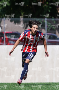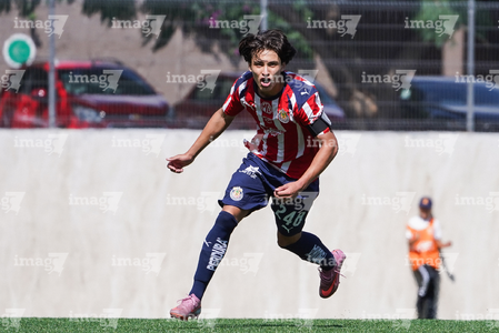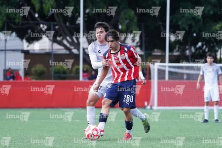 Zapopan, Jalisco, 11 de octubre de 2025. Jesus Mendoza, durante el partido correspondiente a la jornada 14 del torneo Apertura 2025 de la Liga BBVA MX categoría Sub17, entre las Chivas Rayadas del Guadalajara y los Xolos de Tijuana, realizado en Verde Valle. Foto: Imago7/Hugo Ramirez