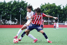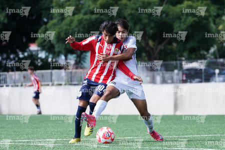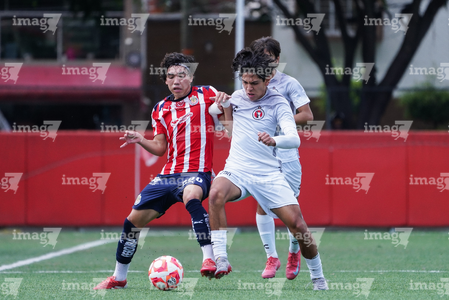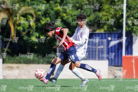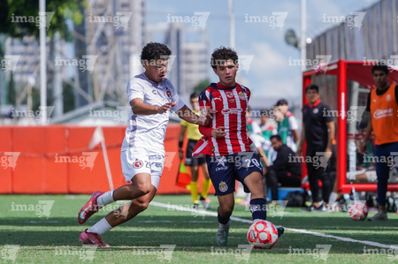 Zapopan, Jalisco, 11 de octubre de 2025. Deibith Armenta y Emiliano Áviles, durante el partido correspondiente a la jornada 14 del torneo Apertura 2025 de la Liga BBVA MX categoría Sub17, entre las Chivas Rayadas del Guadalajara y los Xolos de Tijuana, realizado en Verde Valle. Foto: Imago7/ Hugo Ramirez
