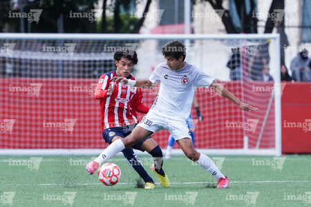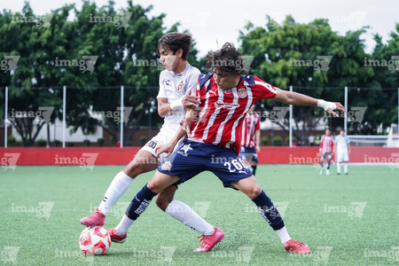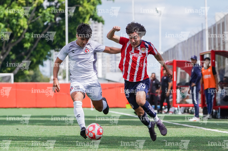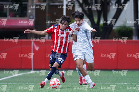 Zapopan, Jalisco, 11 de octubre de 2025. Deibith Armenta y Jesús Barragán, durante el partido correspondiente a la jornada 14 del torneo Apertura 2025 de la Liga BBVA MX categoría Sub17, entre las Chivas Rayadas del Guadalajara y los Xolos de Tijuana, realizado en Verde Valle. Foto: Imago7/ Hugo Ramirez