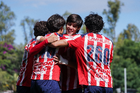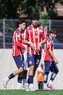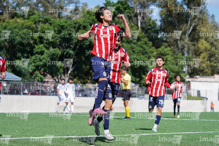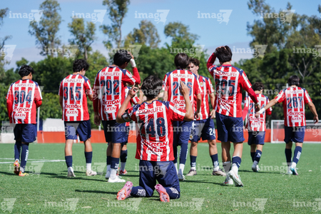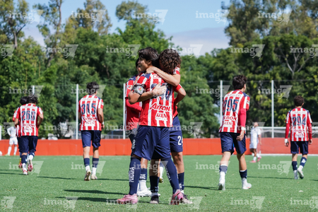 Zapopan, Jalisco, 11 de octubre de 2025. Jugadores de Chivas Sub17 en festejo de gol, durante el partido correspondiente a la jornada 14 del torneo Apertura 2025 de la Liga BBVA MX categoría Sub17, entre las Chivas Rayadas del Guadalajara y los Xolos de Tijuana, realizado en Verde Valle. Foto: Imago7/ Hugo Ramirez
