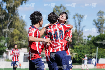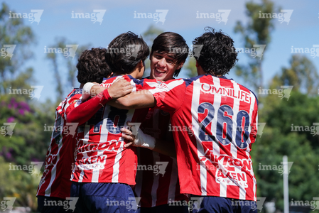 Zapopan, Jalisco, 11 de octubre de 2025. Jugadores de Chivas en festejo de gol, durante el partido correspondiente a la jornada 14 del torneo Apertura 2025 de la Liga BBVA MX categoría Sub17, entre las Chivas Rayadas del Guadalajara y los Xolos de Tijuana, realizado en Verde Valle. Foto: Imago7/ Hugo Ramirez